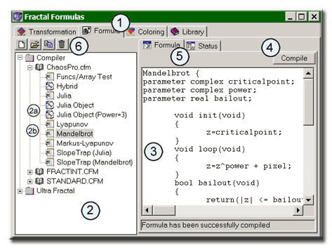 file names: For example you can find several iteration formulas in a file called "ChaosPro.cfm". Warning: Never try to access the same formula from ChaosPro and from an external program! You never know when ChaosPro will overwrite the formula file using its old formula version. In other words: If you expand a formula file in ChaosPro's IDE in order to see the formulas in it, then ChaosPro will read the formula file, parse it and display all formulas. Now the contents of the complete file is in ChaosPro's very own memory. If you now modify the formula file from outside, ChaosPro won't care about it: It has the formulas in memory. Even worse, as soon as you collapse the formulas in the IDE ChaosPro will take its own (perhaps old) formula versions, create the formula file from scratch by simply appending the different formulas and write the file to hard disk. It will overwrite the complete file. ChaosPro won't notice any changes made to the file from any external program! If you start ChaosPro, most probably the IDE (compiler window) will be closed. Please open it by selecting "Menu/ Windows/ Compiler". You will see a window like that: ![]() The formula compiler in ChaosPro supports four "types" of formulas: Transformations, formulas, colorings and libraries. You can choose the formula type by using the tab (1) at the top of the window.